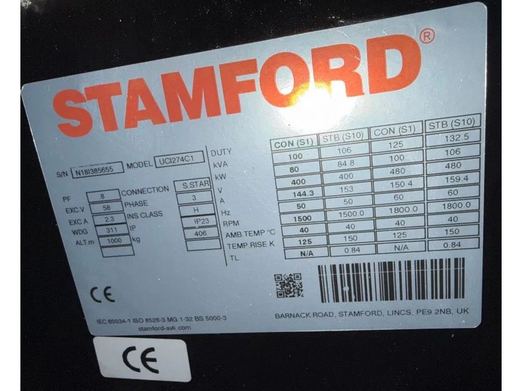 Generator Merk : Stamford Type : UCI274C1 Serie nr : N18I385655 Vermogen : 100 kVA continue Ampère : 144 Amp continue Fasen : 3 Cos phi : 0,8 Voltage : 230/ 400 Volt Frequentie : 50 Hz
