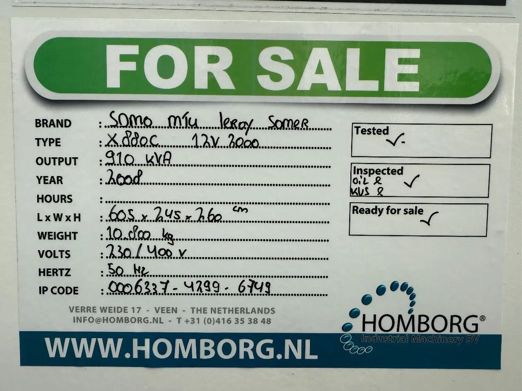 Generator Merk : Leroy Somer Type : LSA 49.1L9A C 6S/4 Serie nr : 230881 / 8 Vermogen : 825 kVA continue, 910 kVA standby Ampère : 1253 Amp continue, 1383 Amp standby Fasen : 3 Cos phi : 0,8 Voltage : 230/ 400 Volt Frequentie : 50 Hz