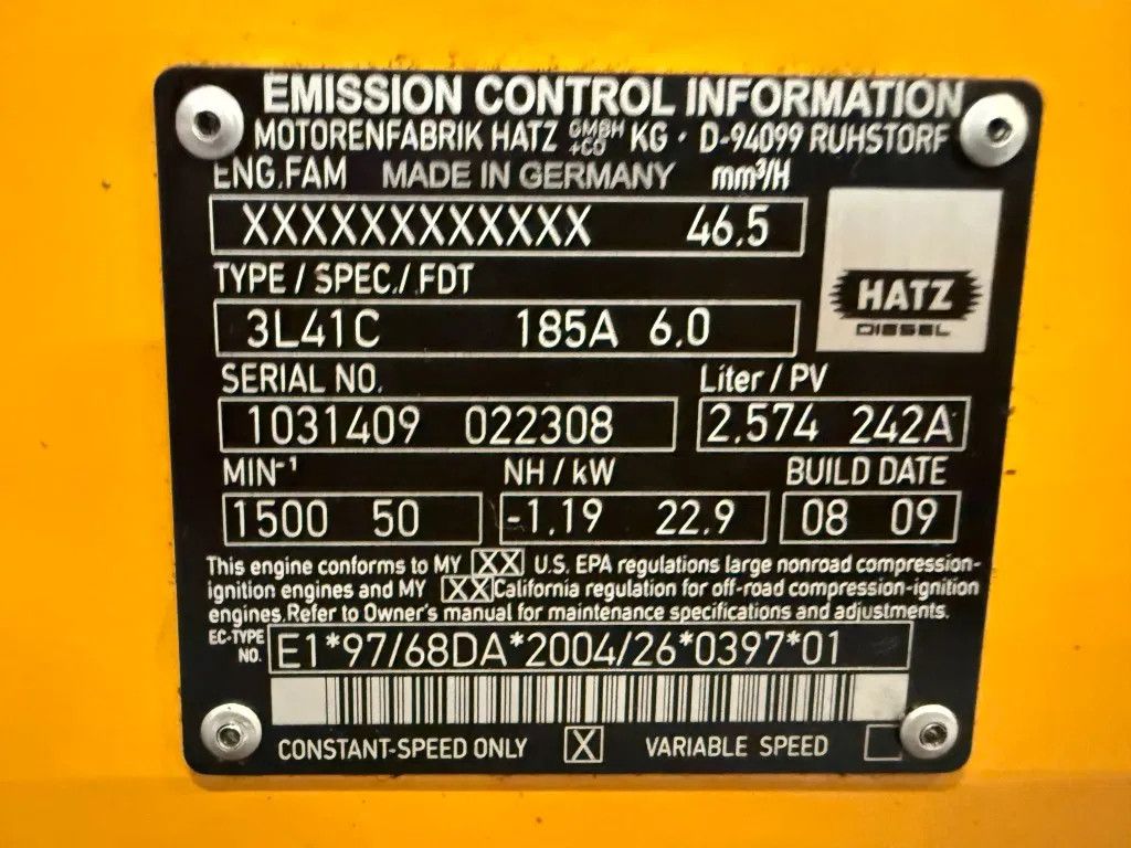 Motor Merk : Hatz Type : 3L41C Serie nr. : 1031409 022308 Vermogen : 22.9 kW / 31.2 PK Koeling : Luchtgekoeld Cilinders : 3 Toerental : 1.500 rpm