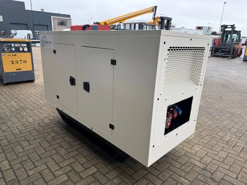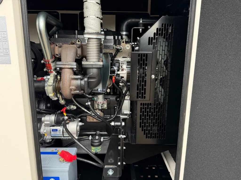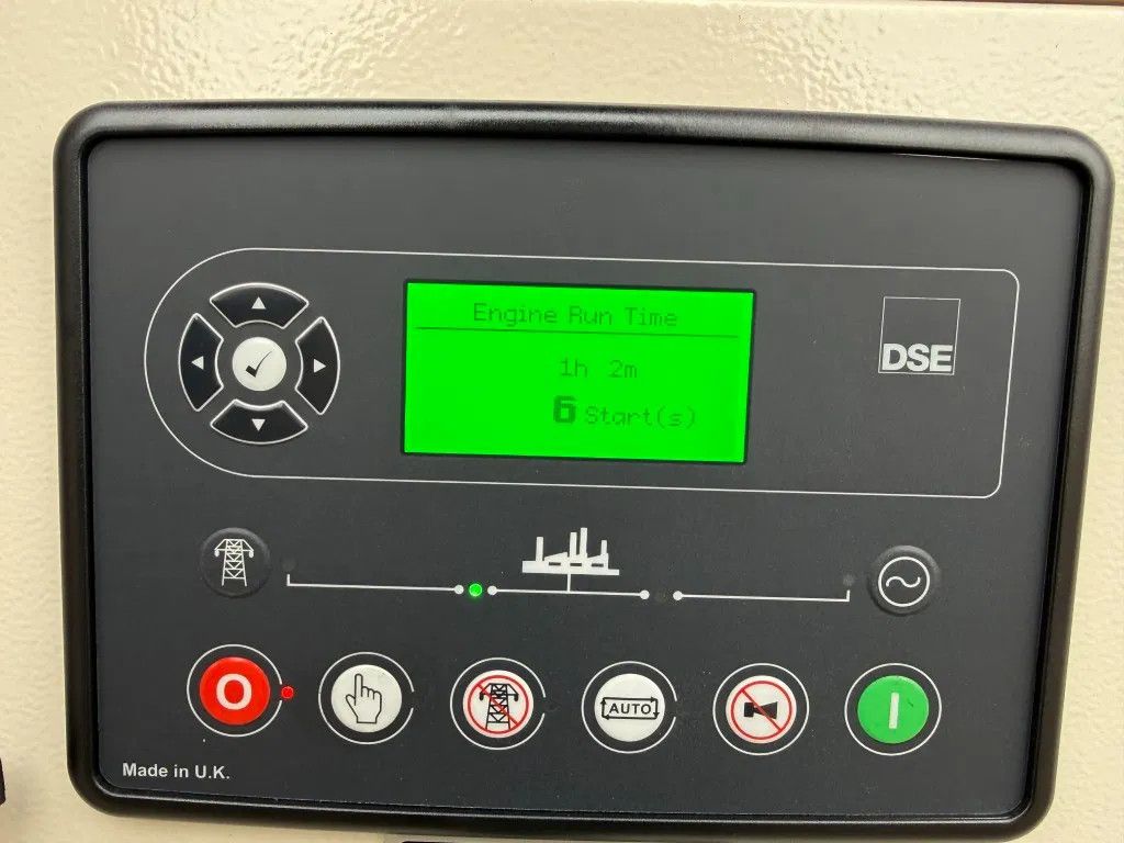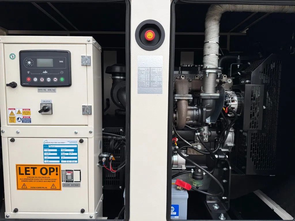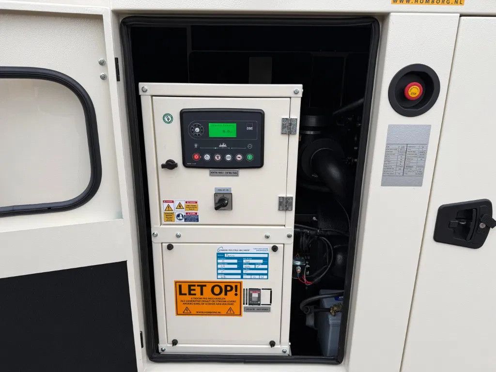 Met: - 100 Ampere ABB breaker - Motorverwarming - Silent omkasting - Interne dieseltank met een inhoud van circa 105 liter - Lekbak - Automatische start en handmatige start 1 x 63 Ampere 400 Volt 1 x 32 Ampere 400 Volt 1 x 16 Ampere 400 Volt 1 x 16 Ampere 230 Volt - Diverse stekkeraansluitingen - Turbo - Motorbeveiliging - Digitaal Deep Sea Electronics DSE bedieningspaneel - Met intern uitlaat systeem