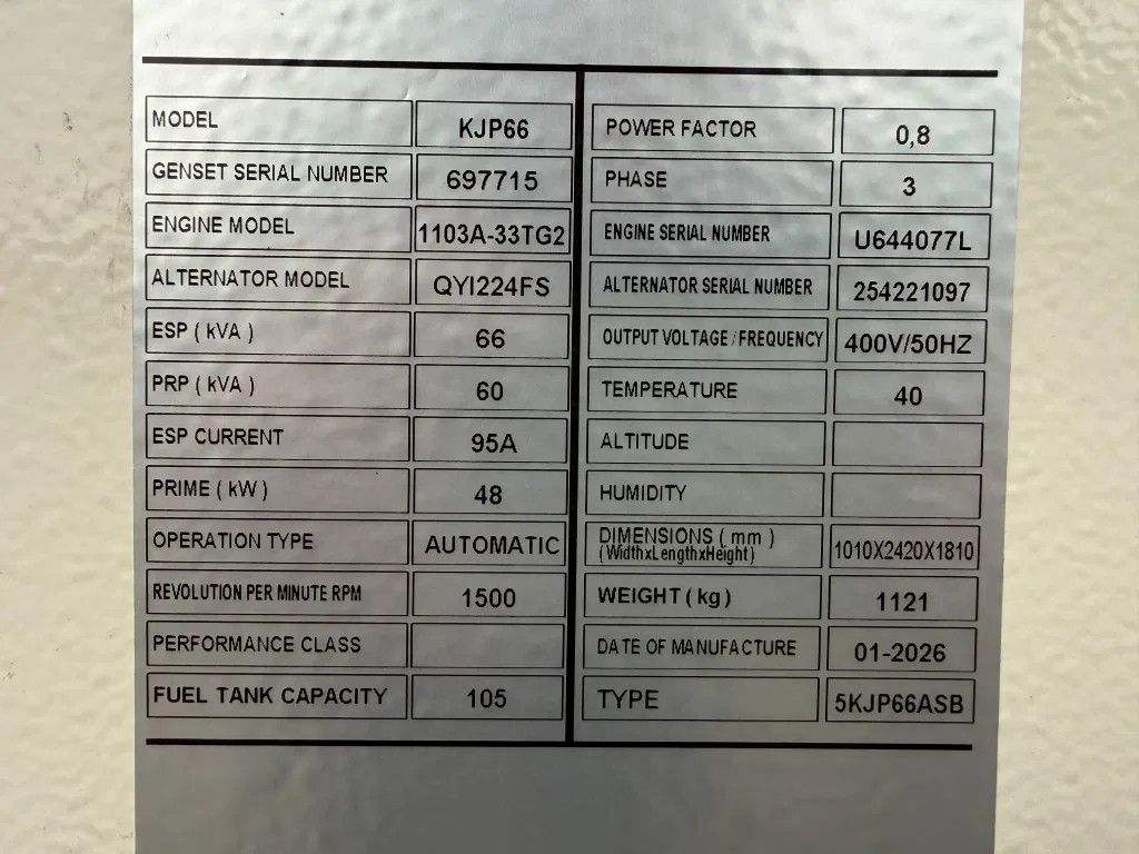 Generator: Vermogen : 60 kVA continue, 66 kVA standby Ampère : 95 Amp Fasen : 3 Cos phi : 0,8 Voltage : 230/ 400 Volt Frequentie : 50 Hz