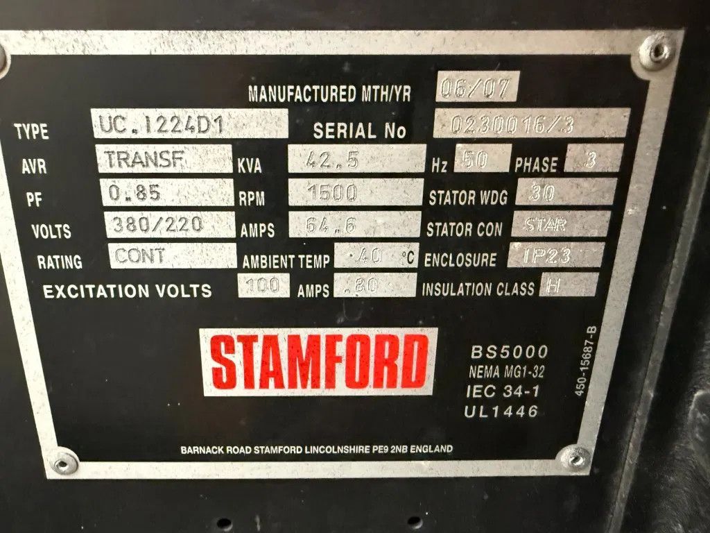 Generator Merk : Stamford Type : UC.I224D1 Serie nr : 0230016/3 Vermogen : 42.5 kVA continue Ampère : 65 Amp continue Fasen : 3 Cos phi : 0,8 Voltage : 230/ 400 Volt Frequentie : 50 Hz