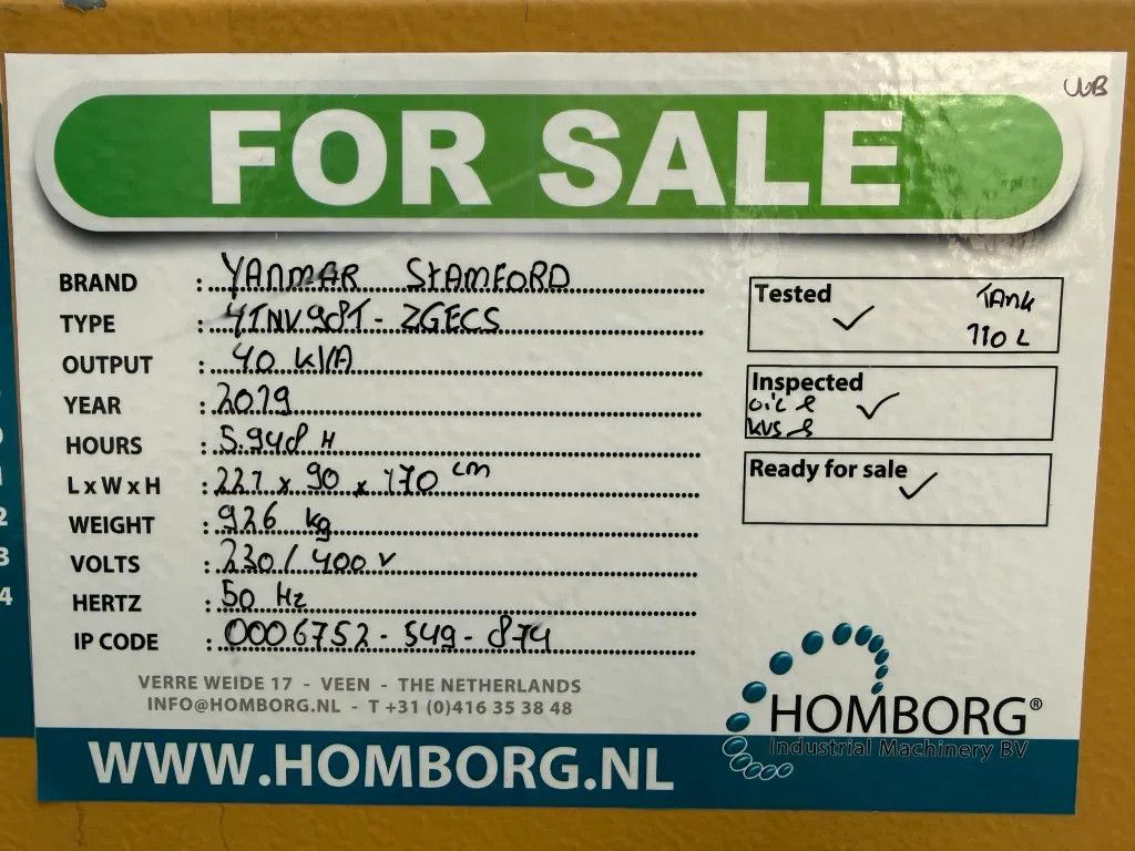 Machine verkeerd in uitstekende staat. Zeer nette generator van bouwjaar 2019 met slechts 5948 draaiuren ! Is op volle belasting getest met loadbank, perfecte staat ! Direct inzetbaar ! Diverse vermogens, 20 kVA, 40 kVA, 60 kVA en 100 kVA uit voorraad leverbaar ! Zie onze website www.homborg.nl voor ons complete aanbod !