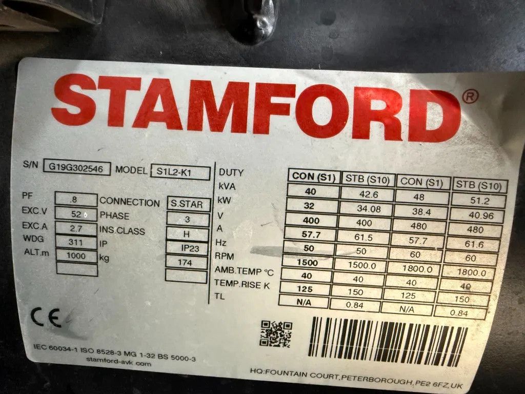 Generator Merk : Stamford Type : S1L2-K1 Serie nr : G19G302546 Vermogen : 40 kVA continue Ampère : 57 Amp Amp continue Fasen : 3 Cos phi : 0,8 Voltage : 230/ 400 Volt Frequentie : 50 Hz