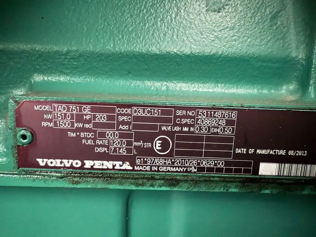 Motor Merk : Volvo Penta Type : TAD 751 GE Serie nr. : 5311487616 Vermogen : 151 kW / 203 PK Koeling : Watergekoeld Cilinders : 6 Toerental : 1.500 rpm