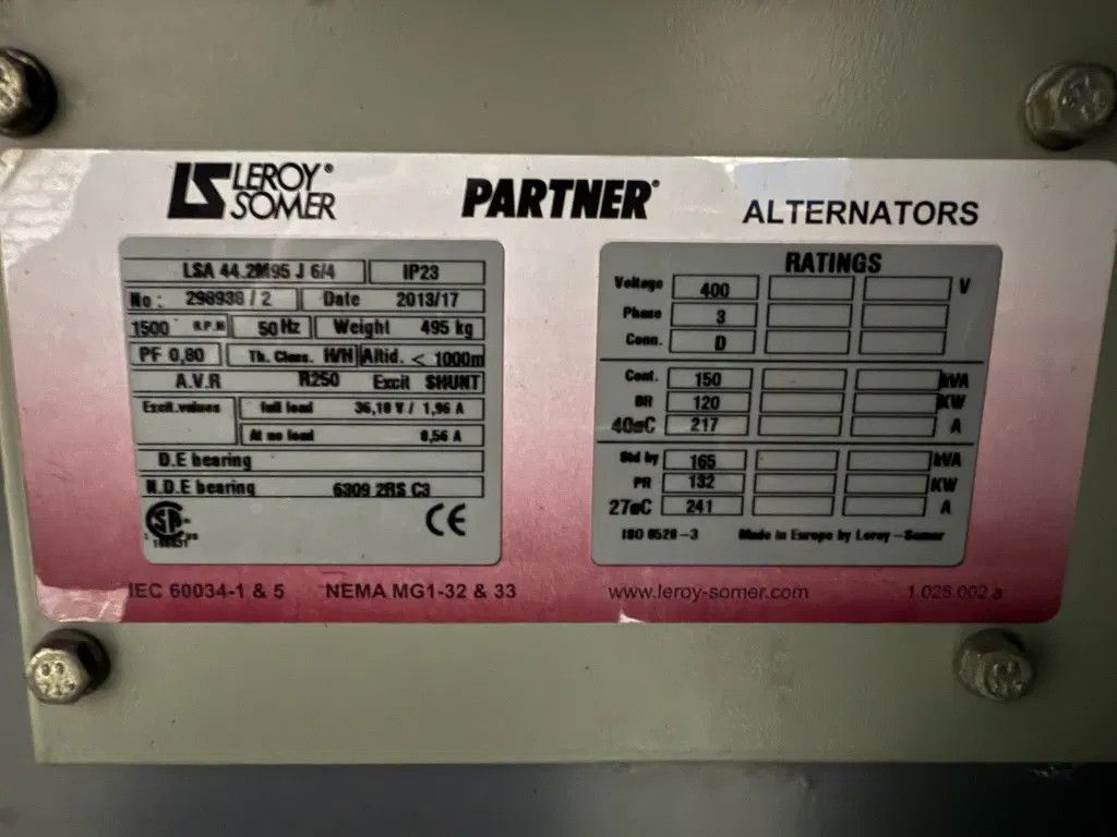 Generator Merk : Leroy Somer Type : LSA 44.2M95 J 6/4 Serie nr : 298938 / 2 Vermogen : 150 kVA continue, 165 kVA standby Ampère : 217 Amp continue, 241 Amp standby Fasen : 3 Cos phi : 0,8 Voltage : 230/ 400 Volt Frequentie : 50 Hz