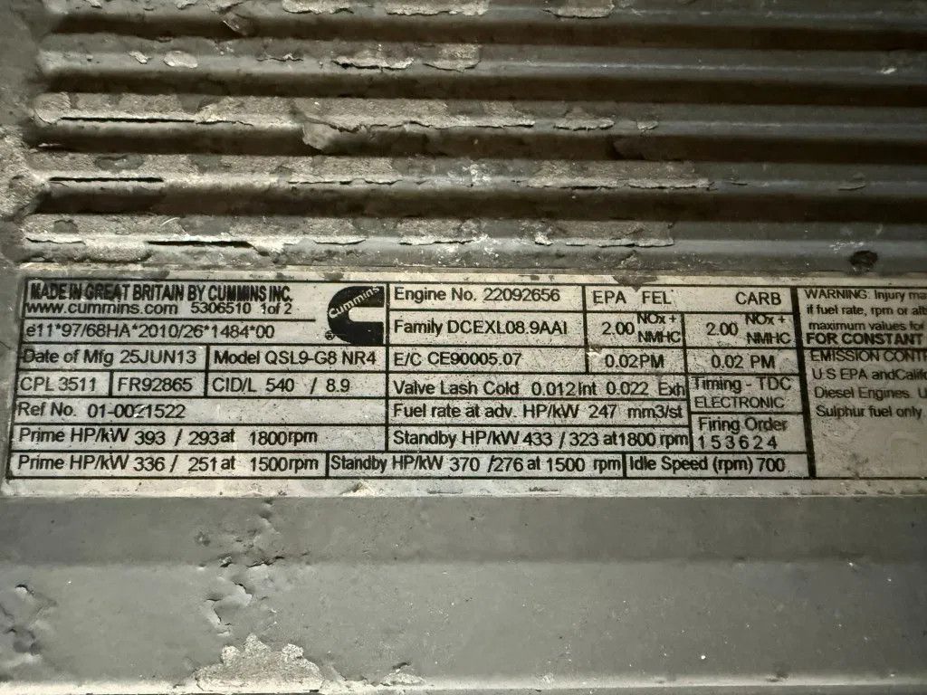 Motor Merk : Cummins Type : QSL9-G8 Motor nr. : 22092656 Vermogen : prime 251 kW / 336 PK Koeling : Watergekoeld Cilinders : 6 Toerental : 1.500 rpm