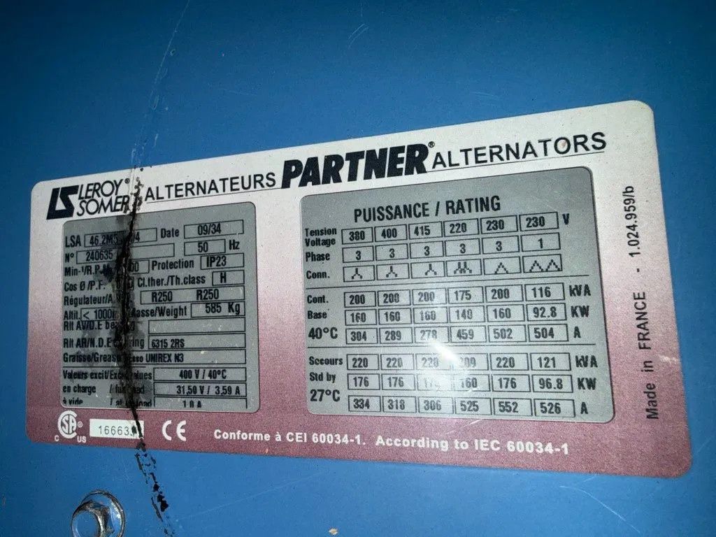 Generator Merk : Leroy Somer Type : LSA 46.2M5 J6/4 Vermogen : 200 kVA continue, 220 kVA standby Ampère : 304 Amp continue, 334 Amp standby Fasen : 3 Cos phi : 0,8 Voltage : 230/ 400 Volt Frequentie : 50 Hz