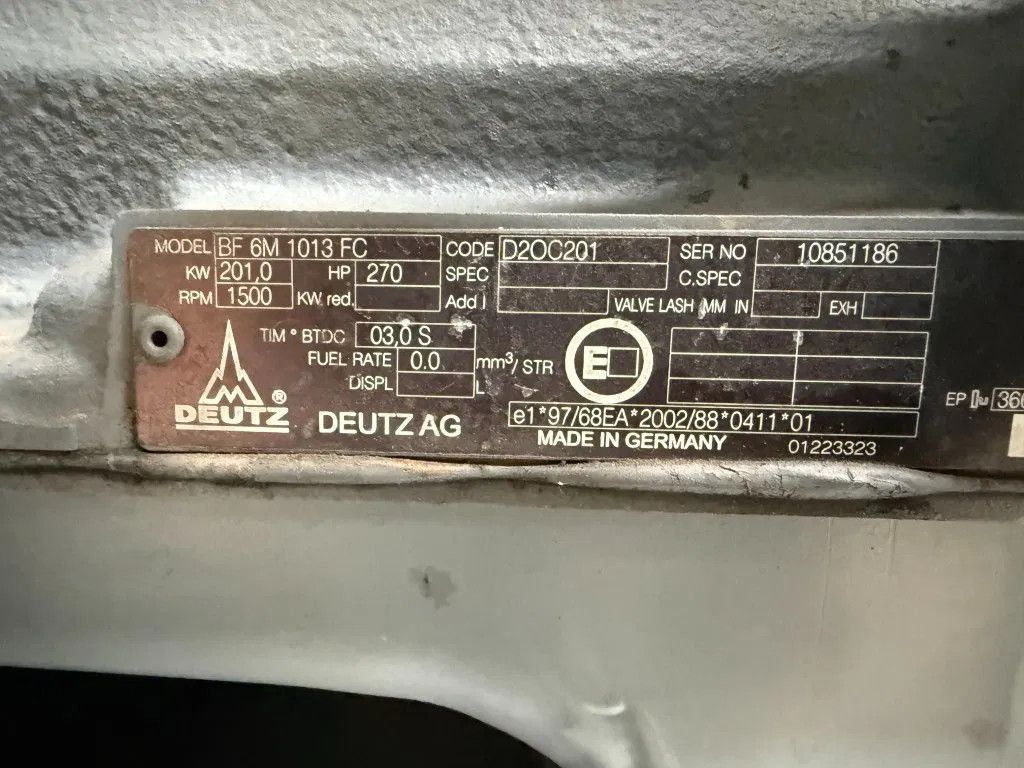 Motor Merk : Deutz Type : BF6M 1013 FC Serie nr. : 10851186 Vermogen : 201 kW / 270 PK Koeling : Watergekoeld Cilinders : 6 Toerental : 1.500 rpm