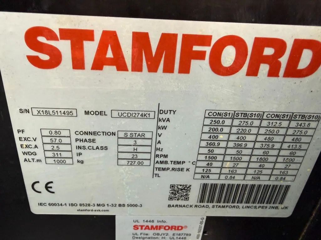 Generator Merk : Stamford Type : UCDI274K1 Serie nr : X18L511495 Vermogen : 250 kVA continue. 275 kVA standby Ampère : 360 Amp continue, 397 Amp standby Fasen : 3 Cos phi : 0,8 Voltage : 230/ 400 Volt Frequentie : 50 Hz